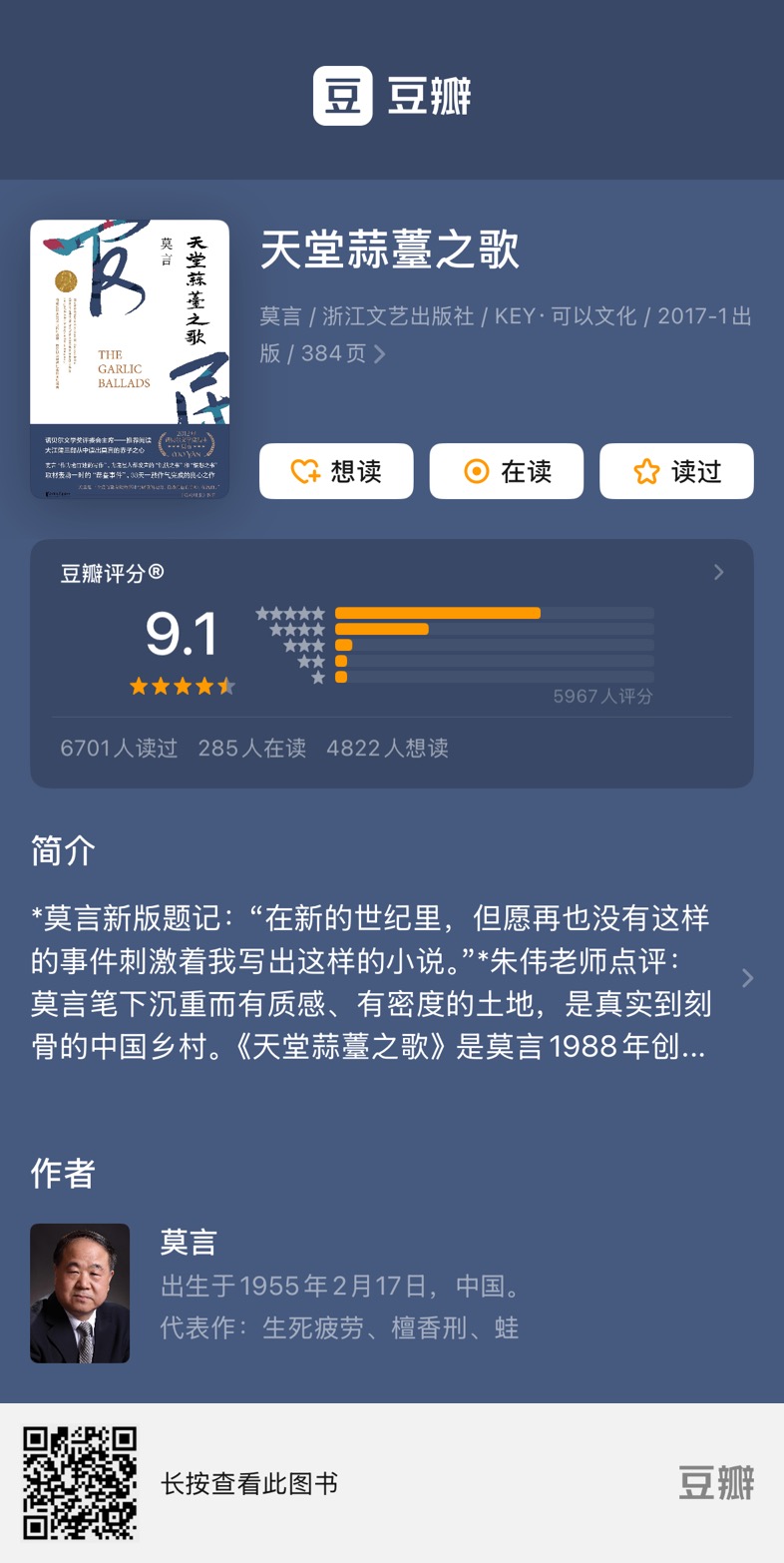 虽然写的快,但还是有莫言独特的文学手法,小说结构比较巧妙,复调叙事,用贯穿始终的民间瞎子艺人张扣的蒜薹之歌进行剧透,又唱出了农民心底的凄苦。腐烂蒜薹的辛辣臭味也是贯穿始终,隔着屏幕都能闻到,农民的希望就这样腐臭的飘扬。书里面的描写直白粗鲁,写刑讯、贫穷、挣扎这些毫不避讳,有一种血淋淋的冷酷。