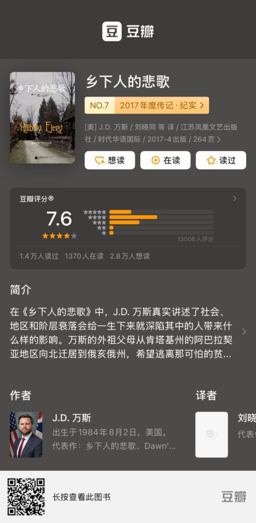 美国副总统万斯成长回忆录,看一看美国的一个乡下人在他所处的环境下是如何成长的。这里面可以看到当代美国社会的撕裂,尤其是白人工薪阶层的心理。