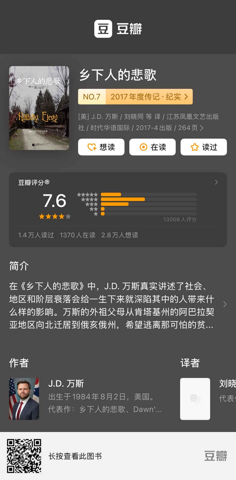 万斯是一个出身贫寒,家庭破碎的“乡下人”,通过海军陆战队和耶鲁法学院这两个重要的节点实现了阶级跨越。他的成长回忆同样也是他的社会观察录,如今他已是美国副总统,看他如何着手改善他的社会观察中的问题。