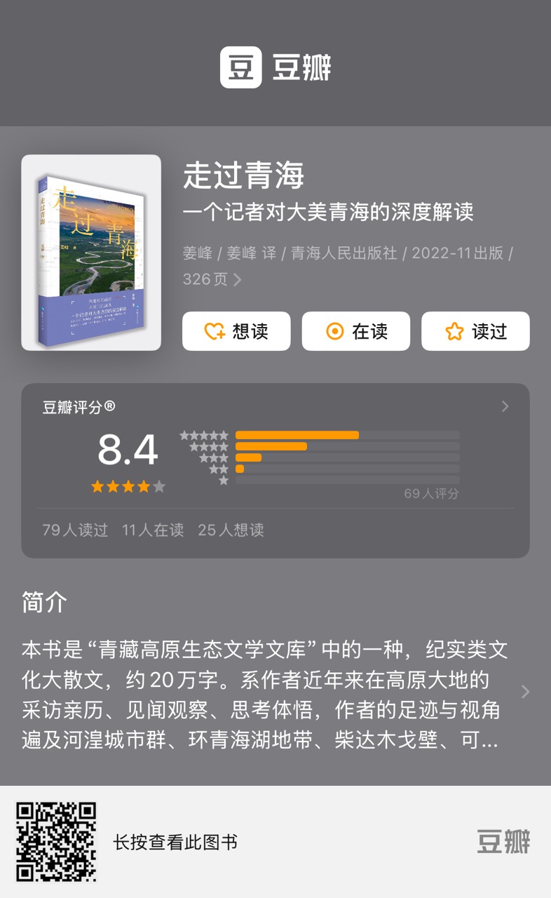 青海是我的故乡,我生于此长于此,可惜我并不太了解她,如今身在外地,却每每找时间去开始了解她,身在的那段时间,没有条件去了解,只是熟悉居住的周边和去过一些就近的地方,如今却往往囿于没有时间。这本书让我了解了不少我的故乡,心念念之,在书中找到些许慰藉,这就是推荐这本书的主要理由。