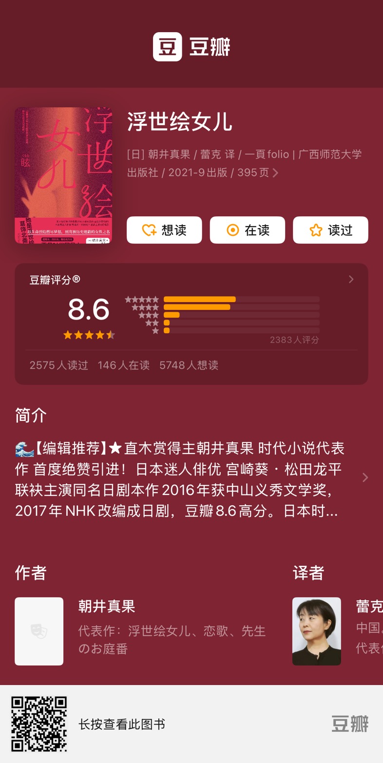 这本书除了重构了葛饰北斋的女儿葛饰应为追求艺术与自我的传奇一生,也将那个时代一幅幅人生的浮世绘展开浮现于眼前:鲜活的江户时代,彷佛能闻到江户街道的烟火气,看到吉原游廊深夜的灯火和哪些婀娜多姿的歌舞伎。